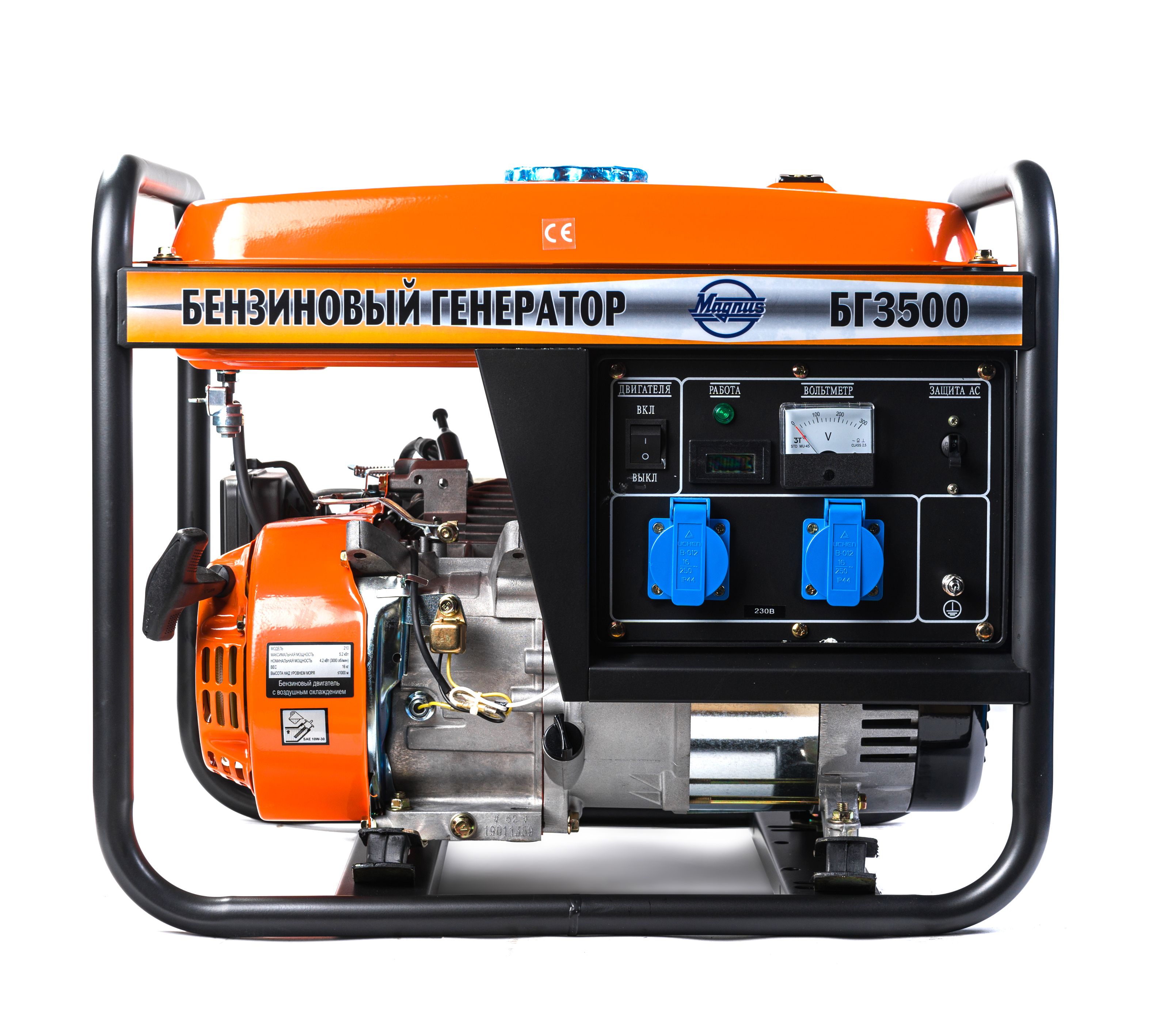 Генератор бензиновый БГ3500, ручной пуск. двигатель OHV 4-тактный с воздушным охлаждением. Выходная мощность: номинал 3,0кВт, максимальная 3,5кВт.